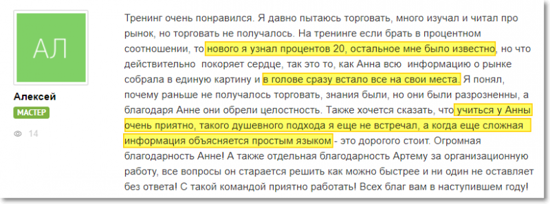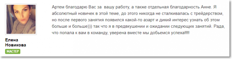 Как можем видеть, и опытные, и начинающие трейдеры находят на занятиях у Анны Зольд то, что им нужно, чтобы преуспеть в профессии FOREX-трейдера.