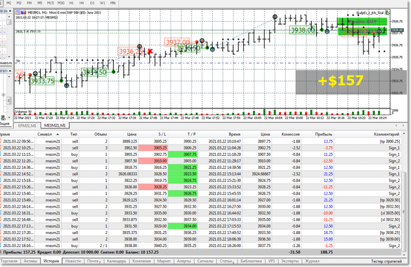 з.ы. Читал, здесь задавались вопросы, почему бот входит иногда по 2 сделки. Так вот, бот входит нормально всегда, это МТ5 так считает сделки, когда переворот в «позе» идет, то есть был шорт, поступил сигнал — лонг, бот перевернулся. И когда сделка закрывается — МТ5 считает 2 контракта и общую прибыль/убыток по этому трейду.