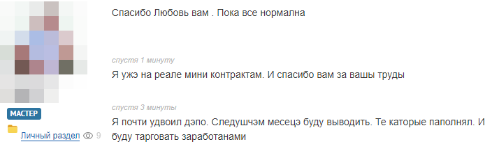 «Уже почти удвоил депо. В следующем месяце буду выводить свои деньги и оставлю только те, что заработал» — пишет участник мастер-группы.