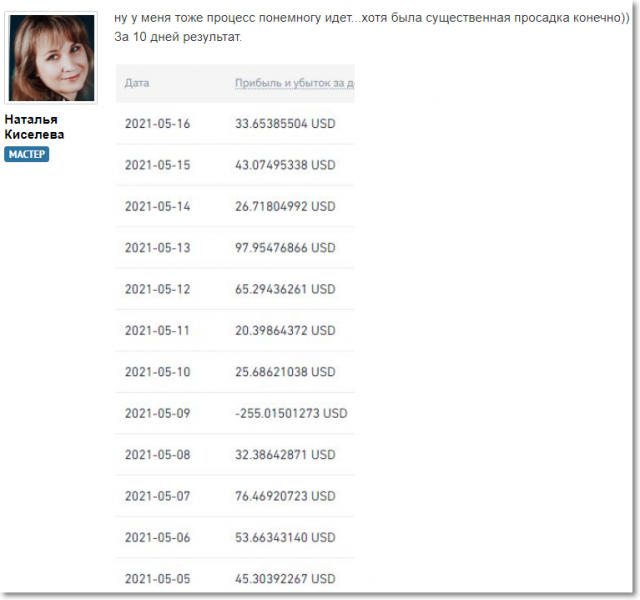 Результат Натальи за 10 дней +265 долларов: