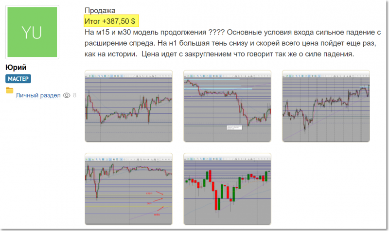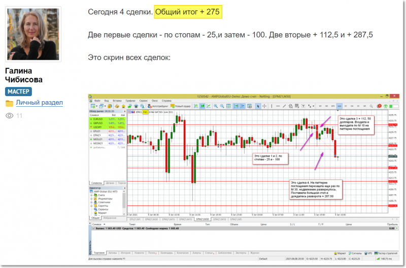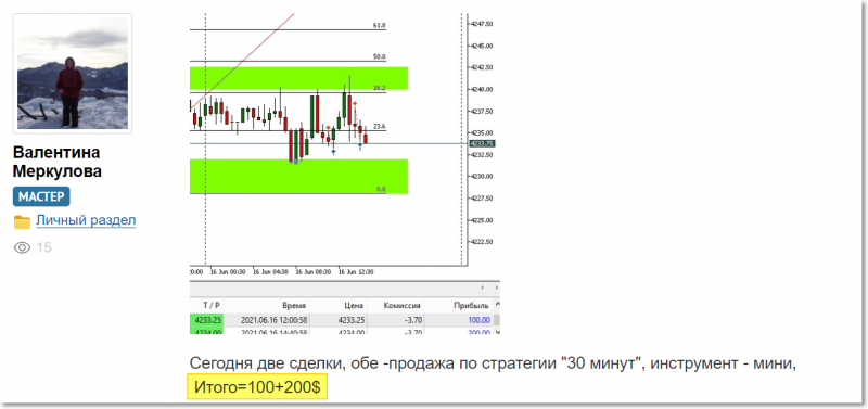 «Сегодня две сделки, обе — продажа по стратегии «30 минут», инструмент — мини, Итого: $100+$200»