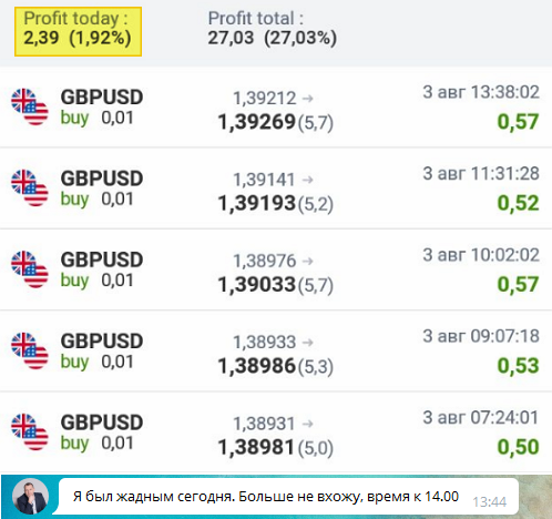 5 минут, затраченные утром на открытие сделки уже приносят 1-2% к депозиту.