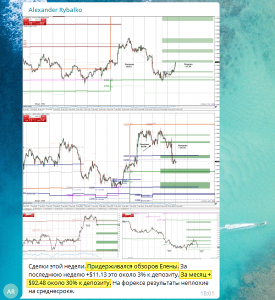 «Сделки этой недели. Придерживался обзоров Елены. За последнюю неделю +$11.13 это около 3% к депозиту. За месяц +$92.48 около 30% к депозиту. На форексе результаты неплохие на среднесроке» — пишет Александр Рыбалко.