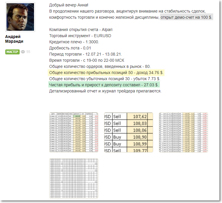 «Акцентирую внимание на стабильность сделок, комфортность торговли и конечно железной дисциплины...»