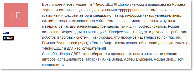 Спасибо, «Инфо-ДВД», что выбираете и предлагаете нам в наставники лучших авторов и специалистов, таких как Анна Зольд, Артём Дудкевич, Роман Зиф... Топ-специалисты!!!»