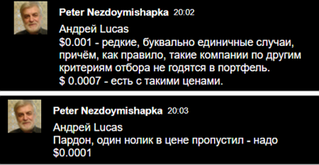 «$0.0001 — редкие и не годятся в портфель, а с ценами $0.0007 есть бумаги» — подтвердил Петр.