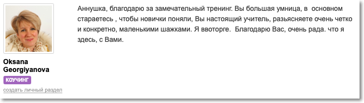 «Аннушка, благодарю за замечательный тренинг. Вы большая умница, стараетесь, чтобы новички все поняли.