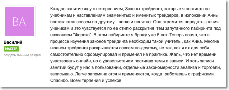 «Каждое занятие жду с нетерпением. Законы трейдинга теперь легки и поняты...»