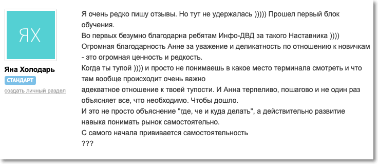 «Безумно благодарна Инфо-ДВД за такого Наставника! Анну благодарю за уважение и деликатность по отношению к новичкам — это огромная редкость и ценность.