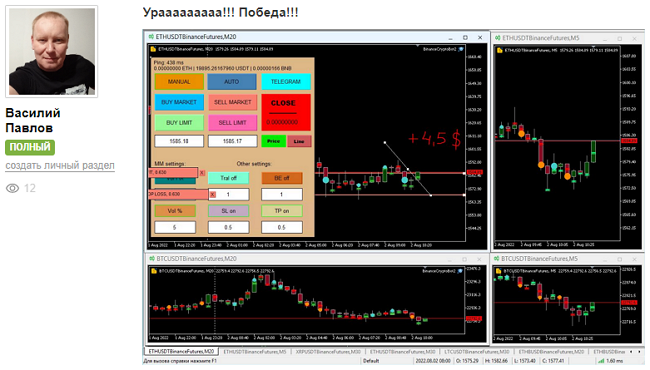 «Думал тренд вниз продолжится, но покупатели развернули. Сделка на покупку закрылась по ТП +4,5$»