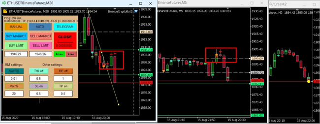 Разворот. На М20 красная полоска, на М5 откат, накопление обазование полукруга вниз красные полоски. Сделка по ТП.