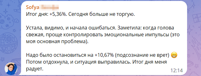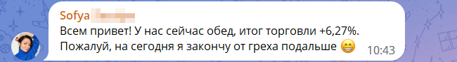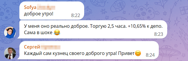 «Утро доброе! У меня оно реально доброе. Торгую 2,5 часа. +10,65% к депо. Сама в шоке 😂» – поделилась София в восемь утра.