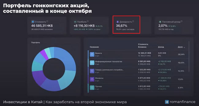 Главный упор Роман сейчас делает на акции китайских компаний. На фоне геополитических потрясений ценные бумаги сильно упали в цене, но прибыль и обороты компаний продолжают расти.