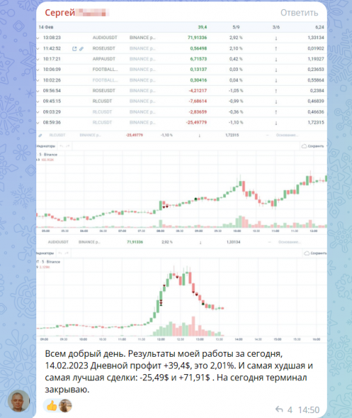 «Результаты моей работы за сегодня, 14.02.2023. Дневной профит +39,4$, это +2,01%»