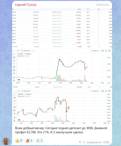 «Сегодня поднял депозит до 300$. Дневной профит 63,78$. Это +21%. И 2 наилучшие сделки»