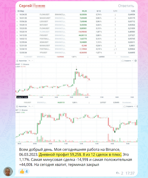 «Дневной профит +59,25$. 8 из 12 сделок в плюс»