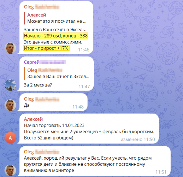 Пишет Олег: «Зашёл в Ваш отчёт в Эксель. Начало: 289 usd, конец: 338. Это данные с комиссиями.