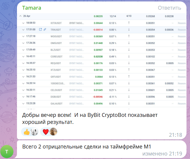 «И на ByBit CryptoBot показывает хороший результат. Всего 2 отрицательные сделки на таймфрейме M1»