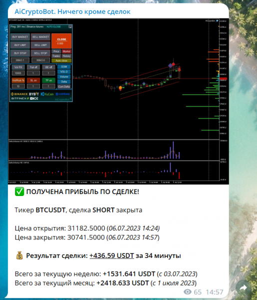 Именно туда его система AiCryptoBot присылает уведомления о том, что сформировалась отличная возможность заработать, и прикладывает скриншот графика.