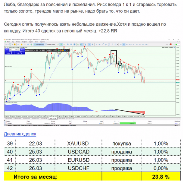 Вот системный результат ученика за месяц: +23,8% за 42 сделки