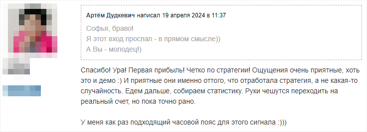 «Ура! Первая прибыль! Четко по стратегии! Ощущения очень приятные, хоть это и демо :)»