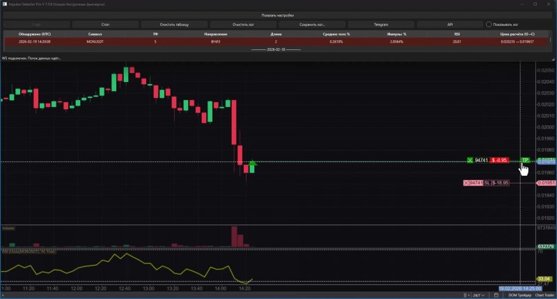 Impulse Detector Pro делает именно это: алгоритм непрерывно анализирует рынок и в реальном времени подсвечивает моменты, когда в сделку ещё не поздно зайти.