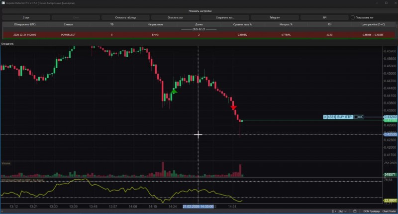 делает именно это: алгоритм непрерывно анализирует рынок и в реальном времени подсвечивает моменты, когда в сделку ещё не поздно зайти.