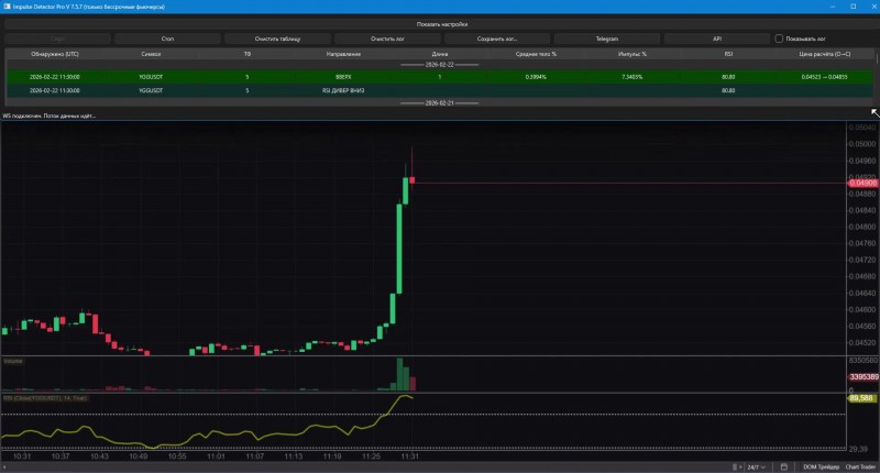 Impulse Detector Pro делает именно это: алгоритм непрерывно анализирует рынок и в реальном времени подсвечивает моменты, когда в сделку ещё не поздно зайти.
