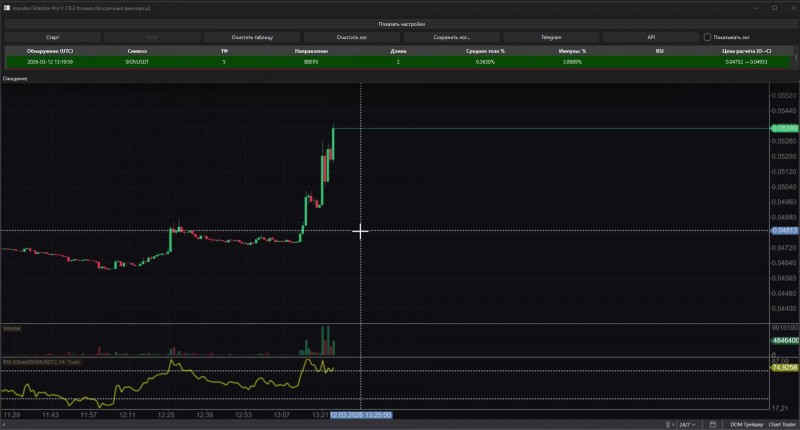 12 марта, как обычно, начинаю торговлю с Impulse Detector Pro. Пришёл сигнал по тикеру SIGN.