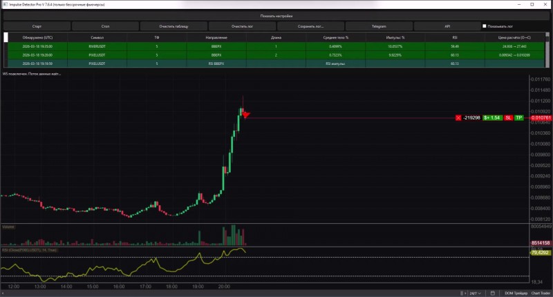 Impulse Detector Pro делает именно это: алгоритм непрерывно анализирует рынок и в реальном времени подсвечивает моменты, когда в сделку ещё не поздно зайти.