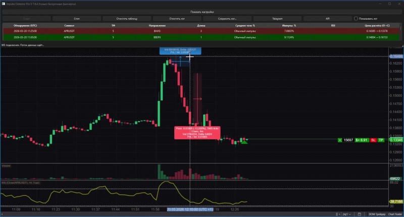 Impulse Detector Pro делает именно это: алгоритм непрерывно анализирует рынок и в реальном времени подсвечивает моменты, когда в сделку ещё не поздно зайти.