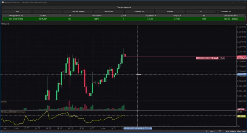 Impulse Detector Pro делает именно это: алгоритм непрерывно анализирует рынок и в реальном времени подсвечивает моменты, когда в сделку ещё не поздно зайти.