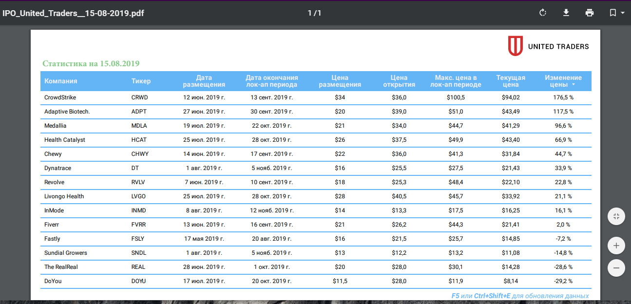 Таблица со статистикой сделок IPO, проведенных у United Traders: