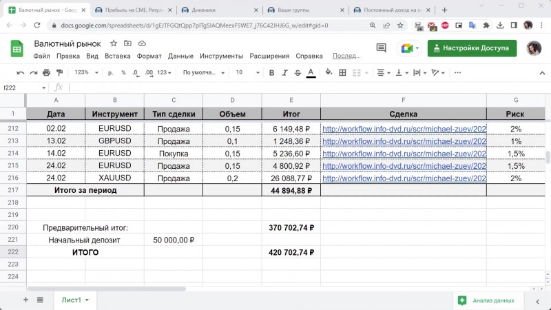 Начиная с марта 2022 года Любовь ведет новый, подробный дневник сделок — по торговле на валютном рынке. Тот самый дневник, который она буквально заставляет вести всех своих учеников.