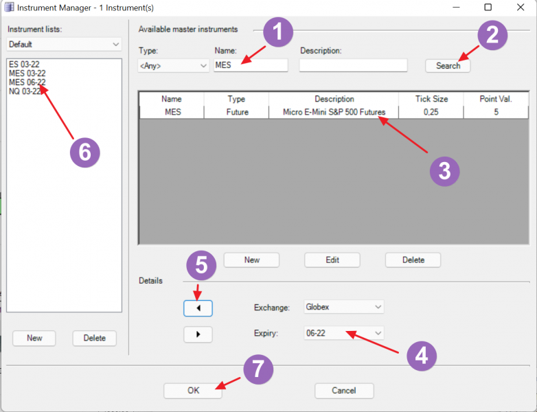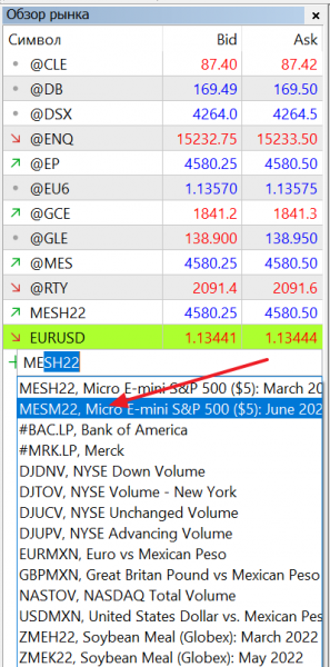 Далее в диалоговом окне выбрать инструмент ES 06-22 (или MES 06-22 если вы торгуете микро-контракт) и добавить его в список: