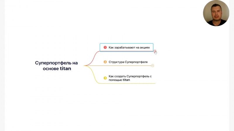 Структуру портфеля: основная часть капитала лежит в акциях (в видео — пример на Сбербанке; это не ИИР), меньшая — у Титана; типичные доли 80/20–90/10. Возможен вариант без «отдельной доли» — робот работает на фьючерсах под залог акций в портфеле.