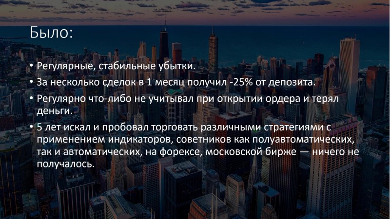 - 5 лет искал и пробовал торговать различными стратегиями с применением индикаторов, советников как полуавтоматических, так и автоматических, на форексе, московской бирже — ничего не получалось