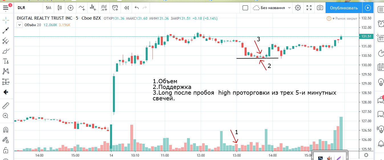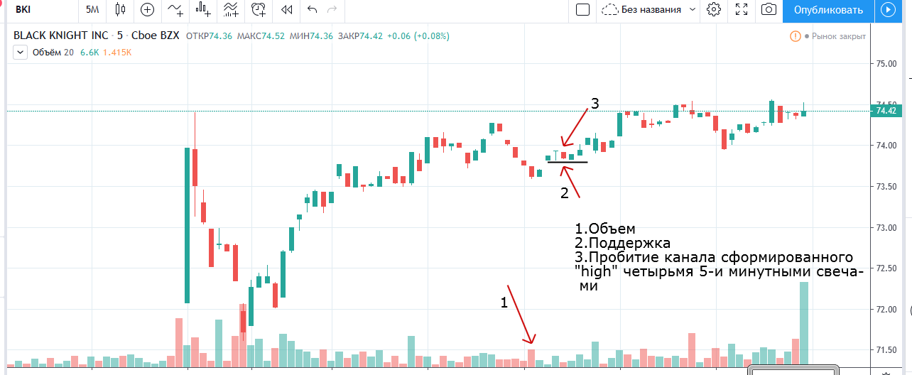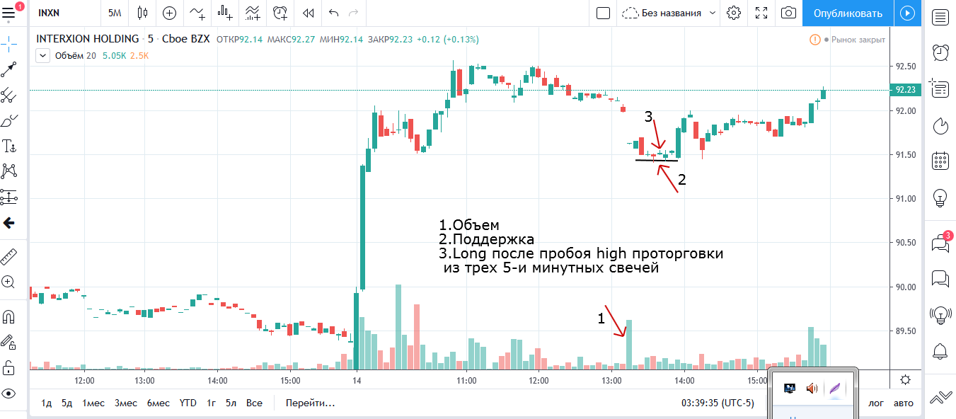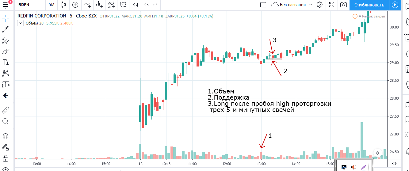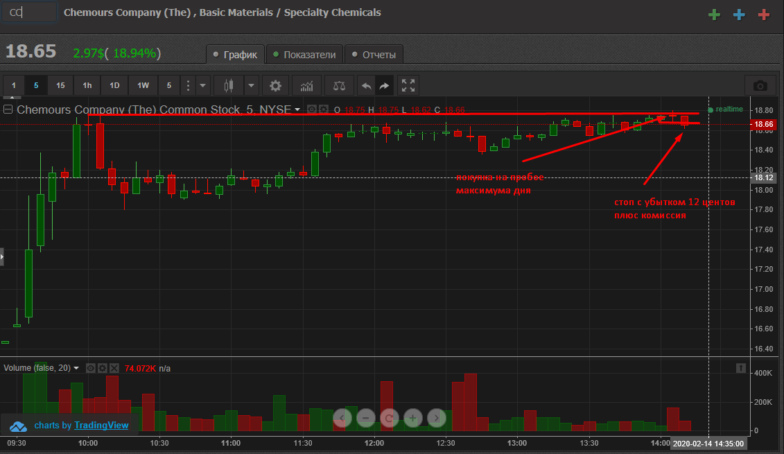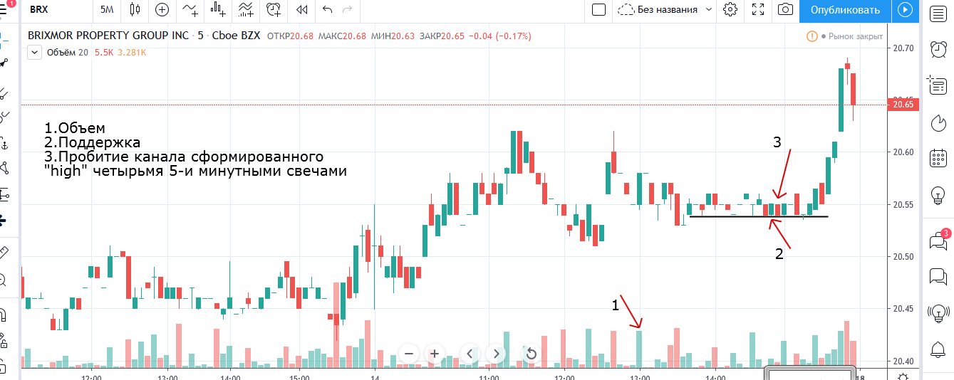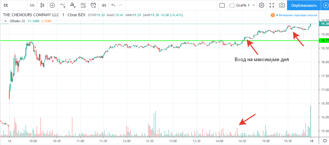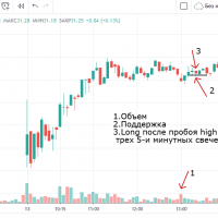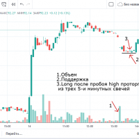 Вход на максимуме дня + объем и выход по стопу на 5 минутках