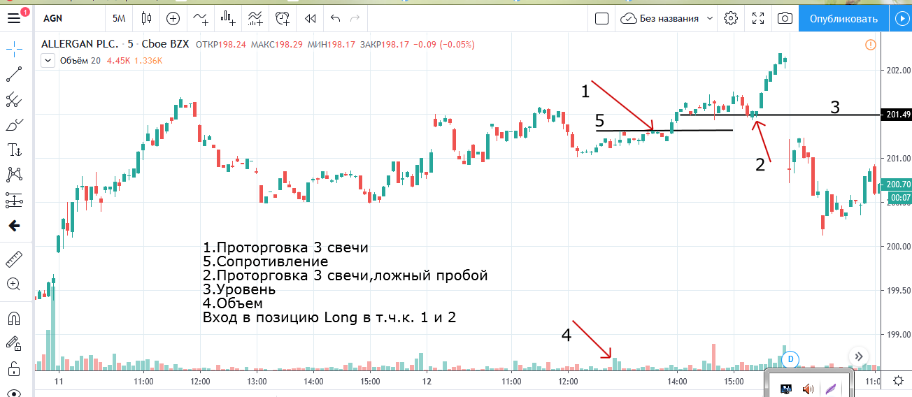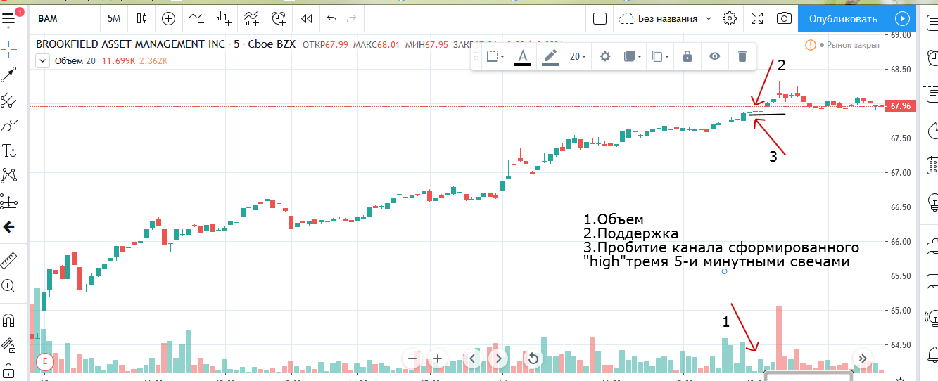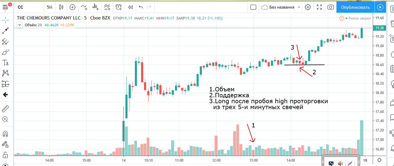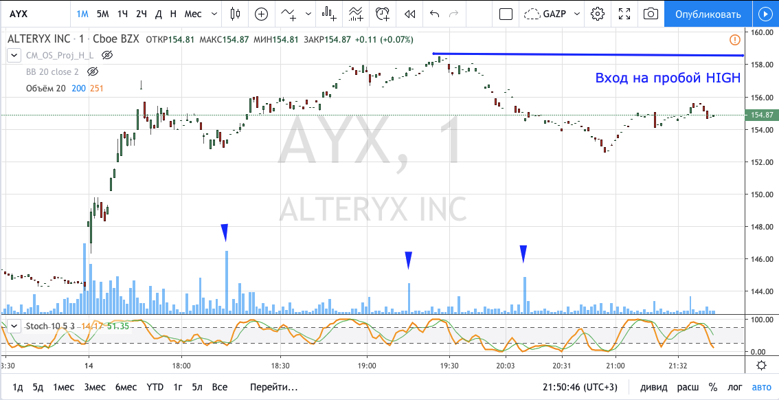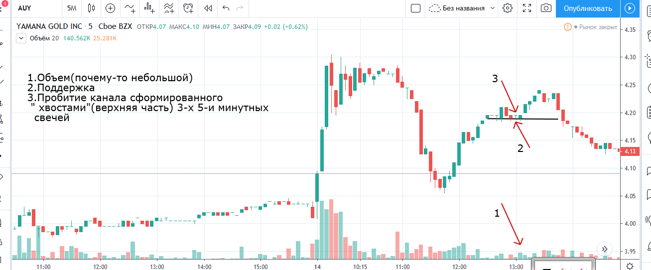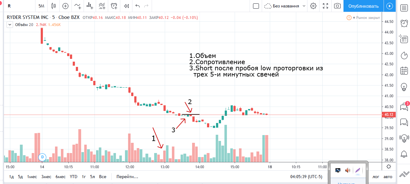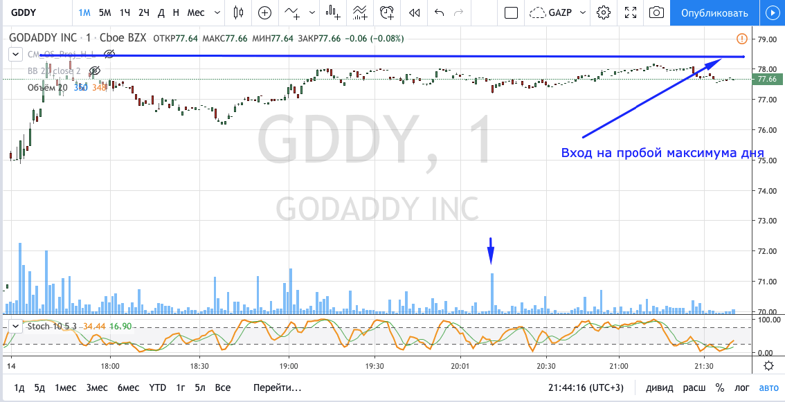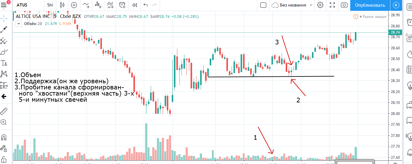 Вход на максимуме дня + объем и выход по стопу на 5 минутках