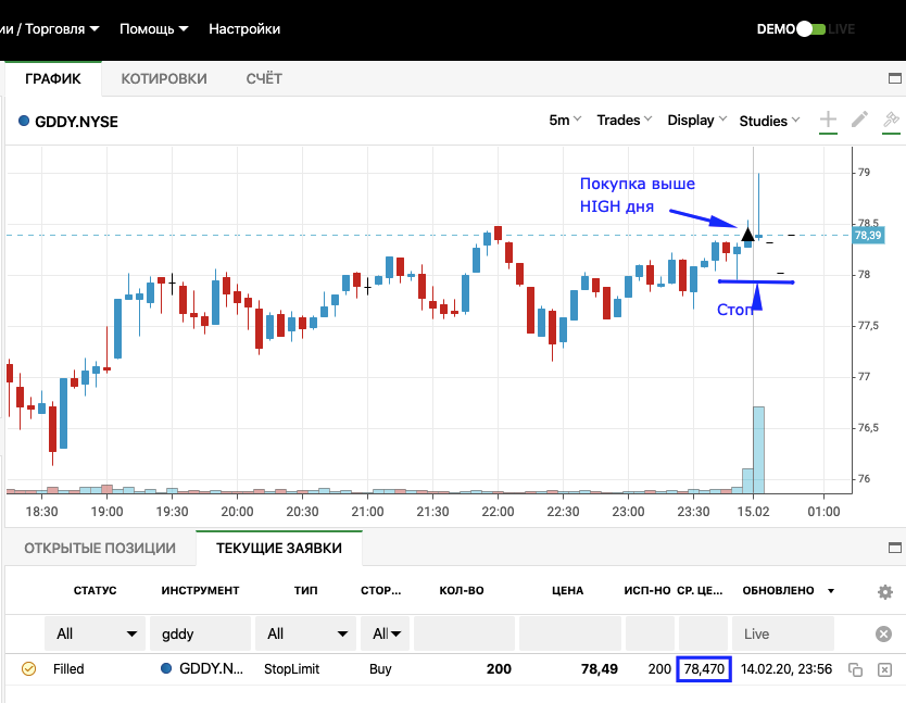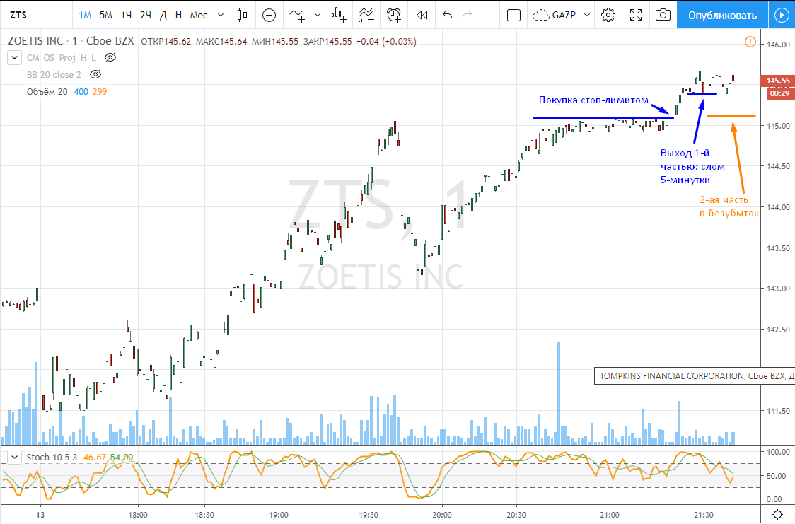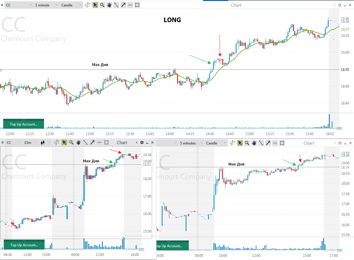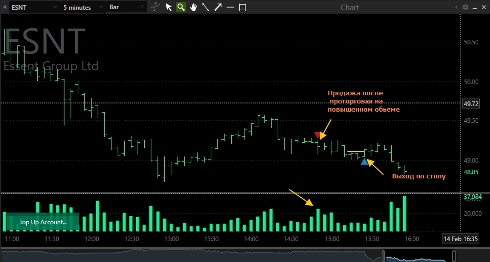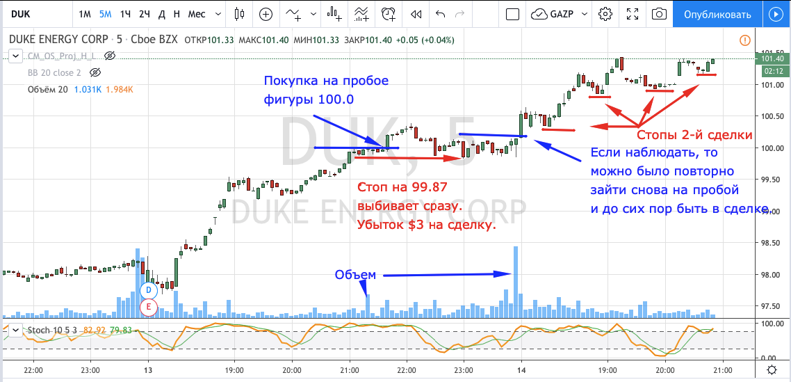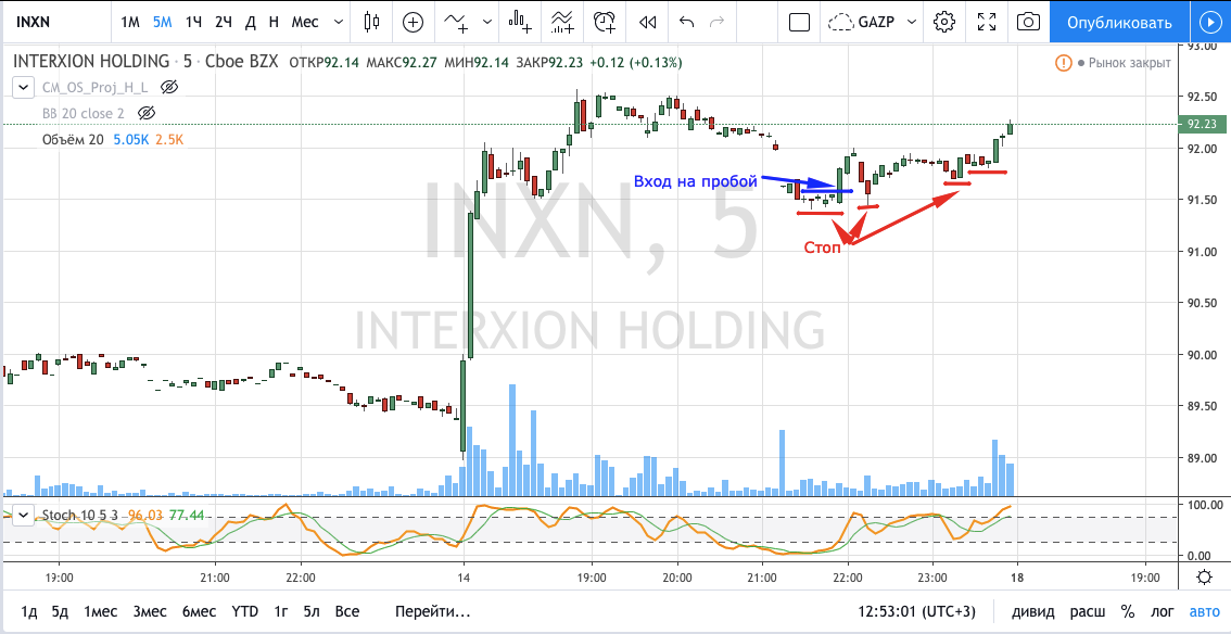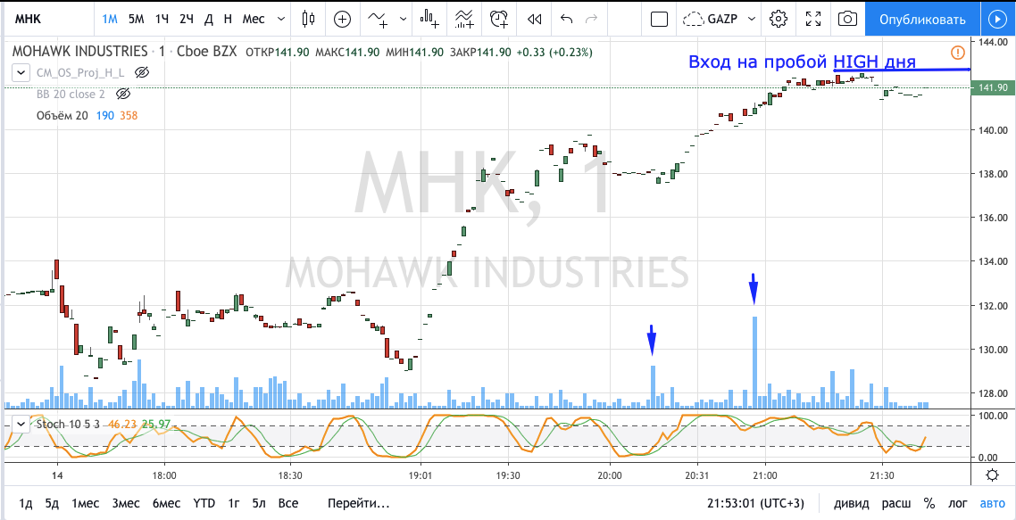 Вход на максимуме дня + объем и выход по стопу на 5 минутках