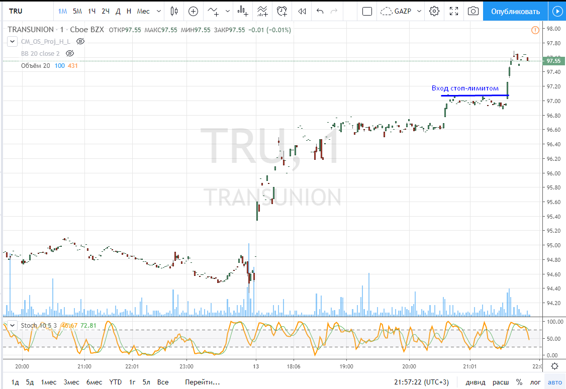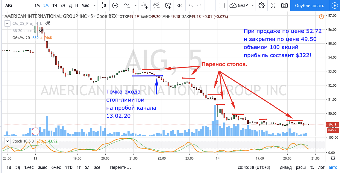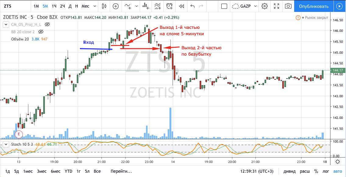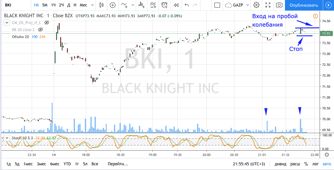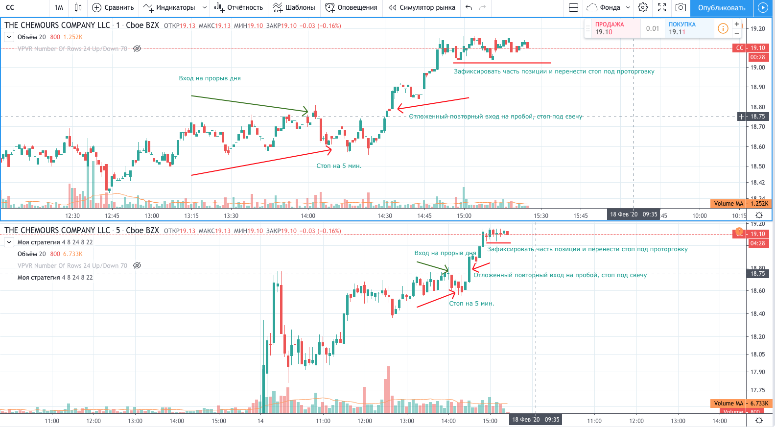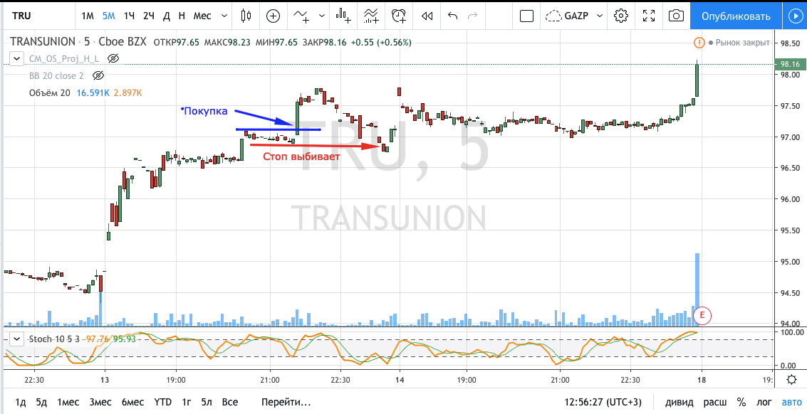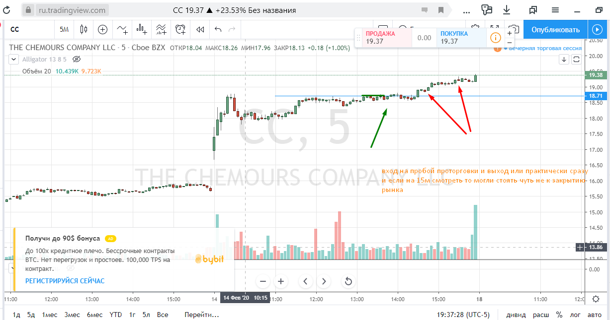 Вход на максимуме дня + объем и выход по стопу на 5 минутках