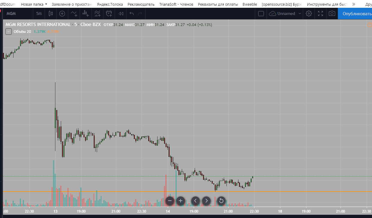 так же привлекла внимание акция AAT. открылась она выше закрытия предыдущего дня. с течении дня немного опустилась и долго стояла на уровне  около 46 дол за акцию. в 21 час мск и 13 ньюйорка можно было выставить отложенный ордер на покупку примерно на 2 цента выше. цена долго стояла но к концу рабочего дня выросла прилично. можно было выставлять стоп лос внизу на 5 мин свече и передвигать этот стоп лос до конца торгов.