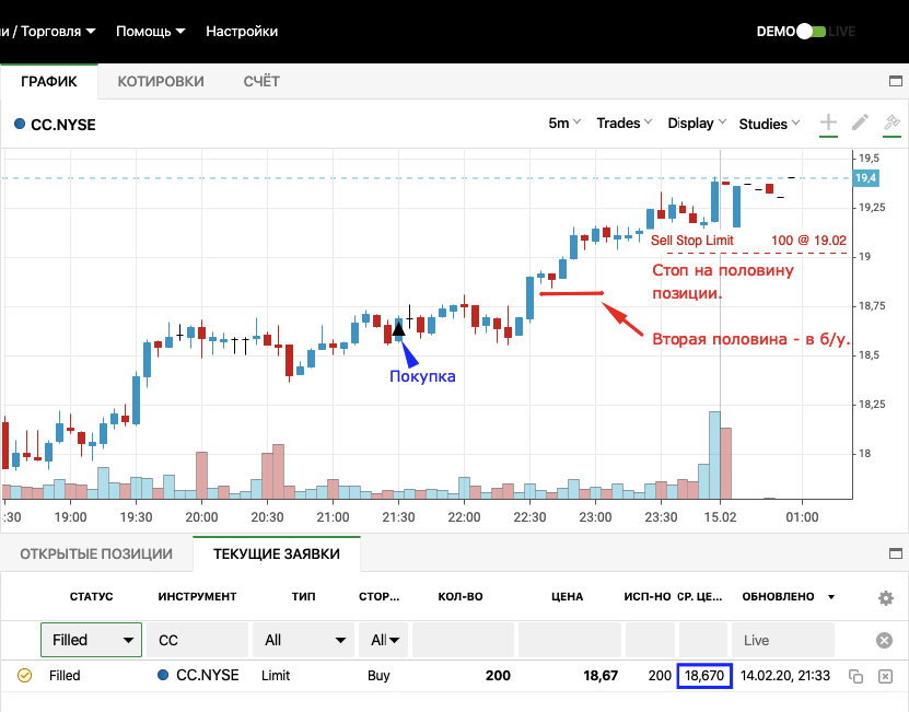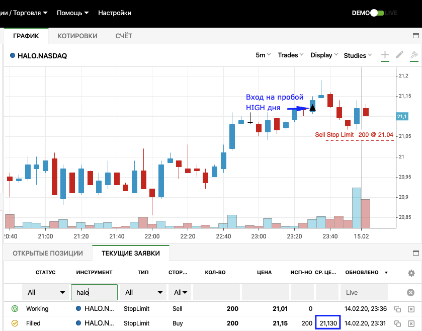 Сделки на демо открыты по: CC, GDDY, HALO. Остальные - на "бумаге".