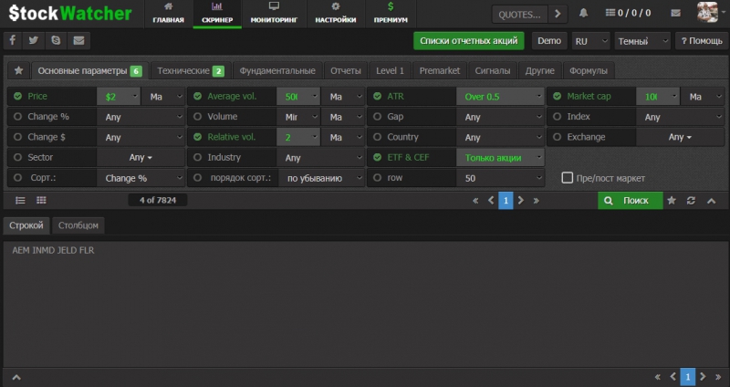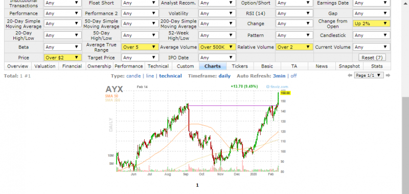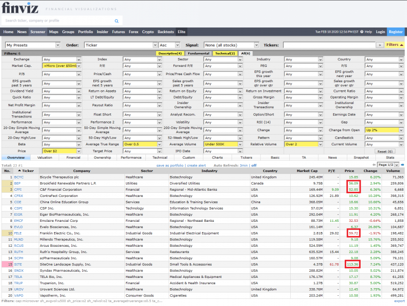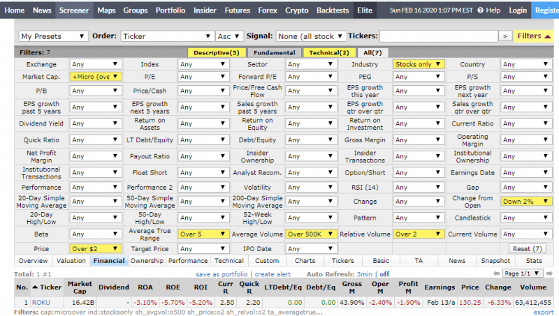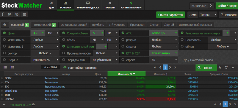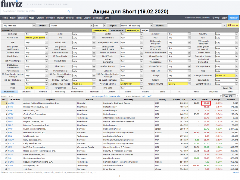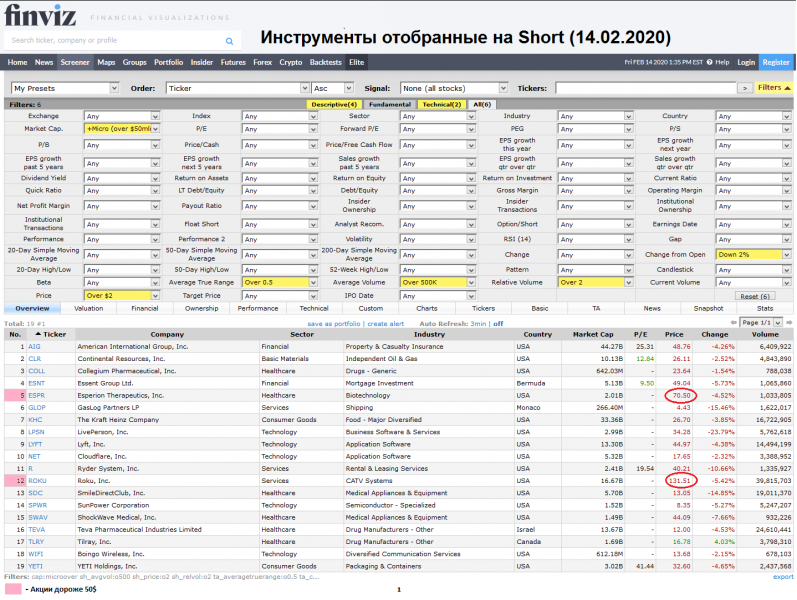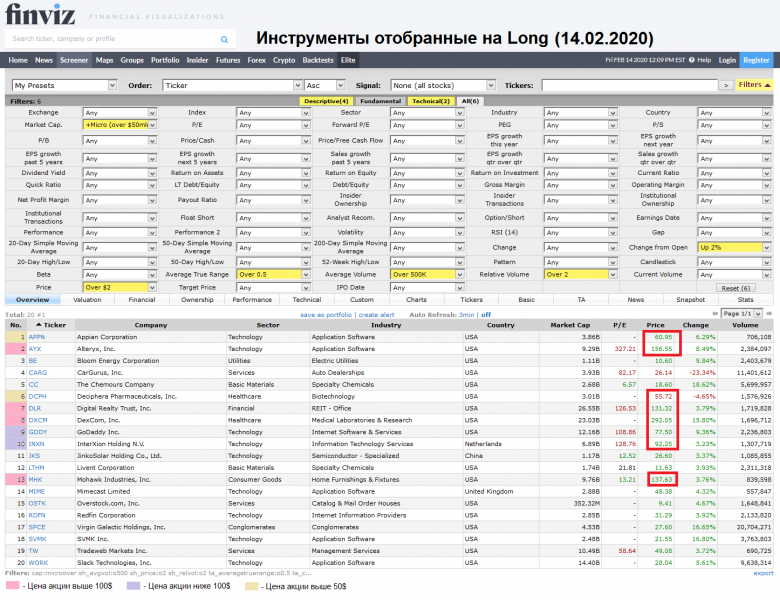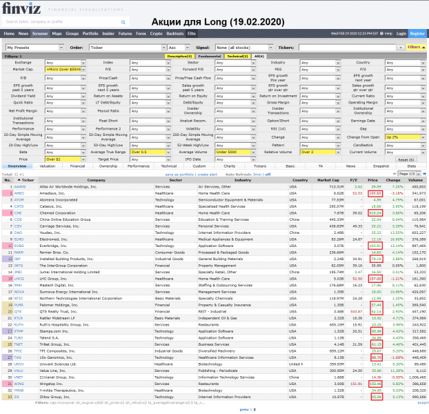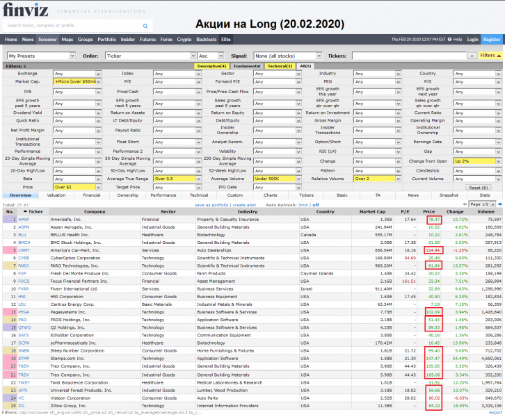 Акций для торговли, отобранные на finviz.