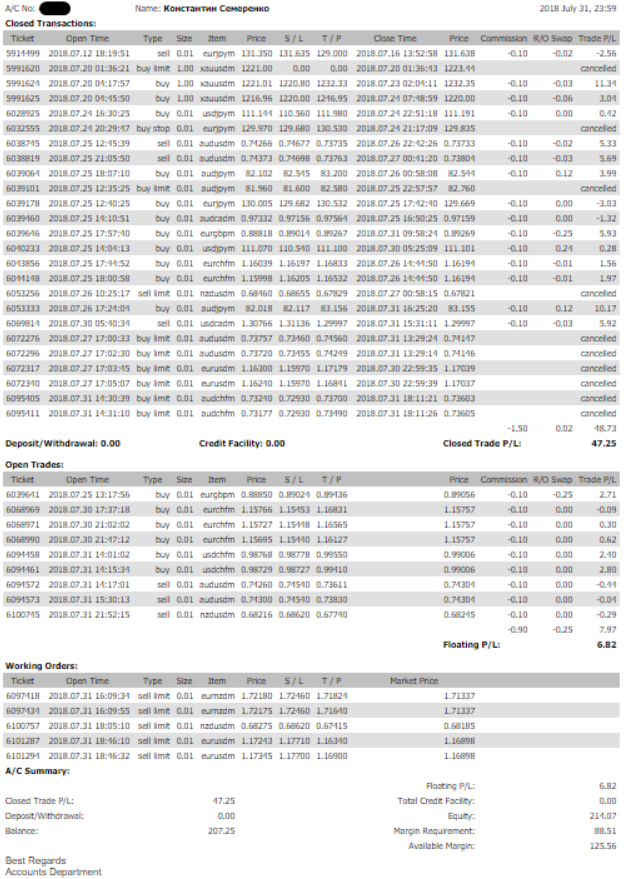 Еще во время тренинга решил сразу открыть реальный счет, чтобы набирать опыт и настраивать психологию. Открыл тестовый реальный счет на 160$, торговал не каждый день, где-то 2-3 дня в неделю и по пол часа до и после работы.