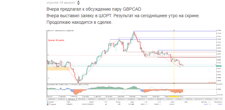 «Вчера предлагал к обсуждению пару GBPCAD. Вчера выставил заявку в ШОРТ. Результат на сегодняшнее утро на скрине. Продолжаю находиться в сделке». [426,57 руб.]