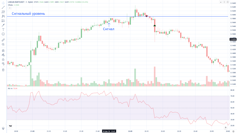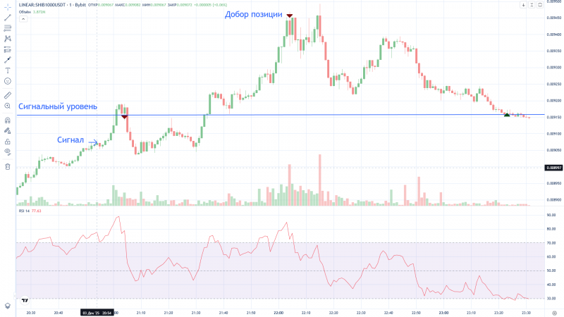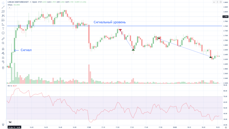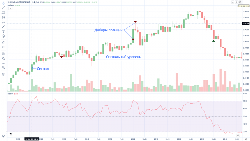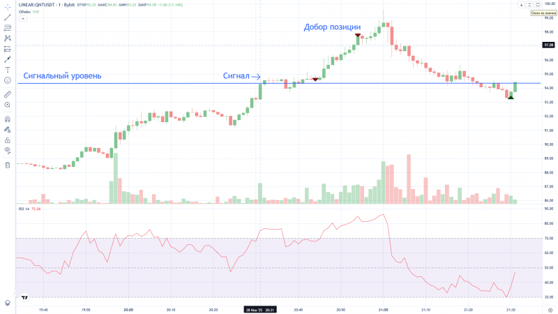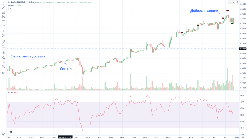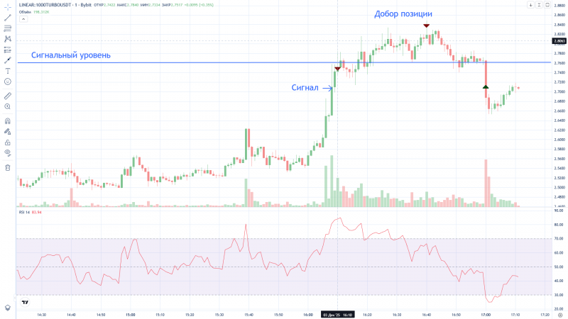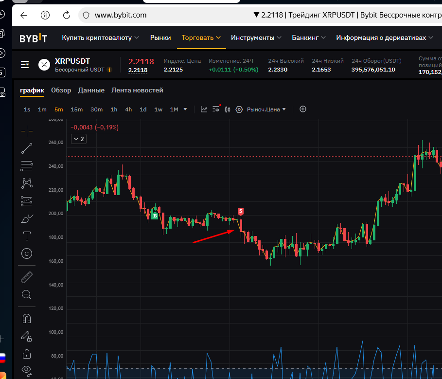 Странно, Дневник трейдера "нарисовал" вход в сделку на 2 минуты раньше фактического входа (вошёл в 16:12, а на графике 16:10). На графике BYBIT сделка отражена верно.