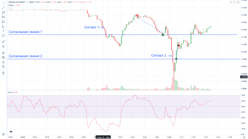 У меня скромнее, "всего" 6,5% к депозиту ). Чуть прокатился вниз по первому сигналу и столько же вверх по второму сигналу. Шаг цены у ALCH дорогой, поэтому пришлось постоянно передвигать стоп за экстремум предыдущей свечи на М1.