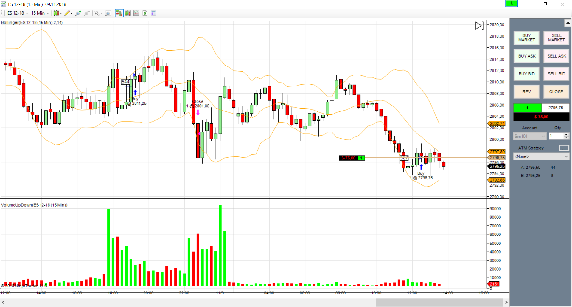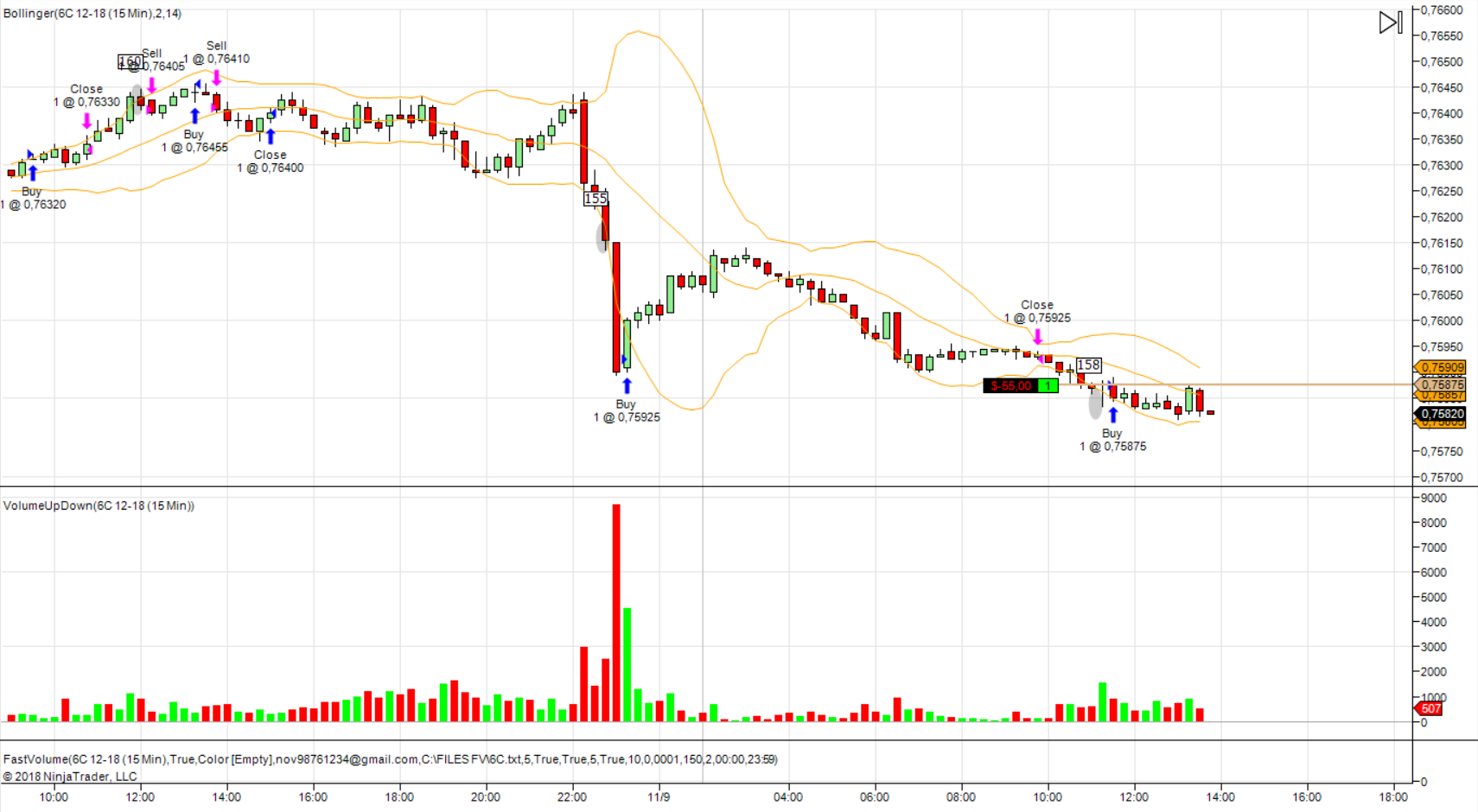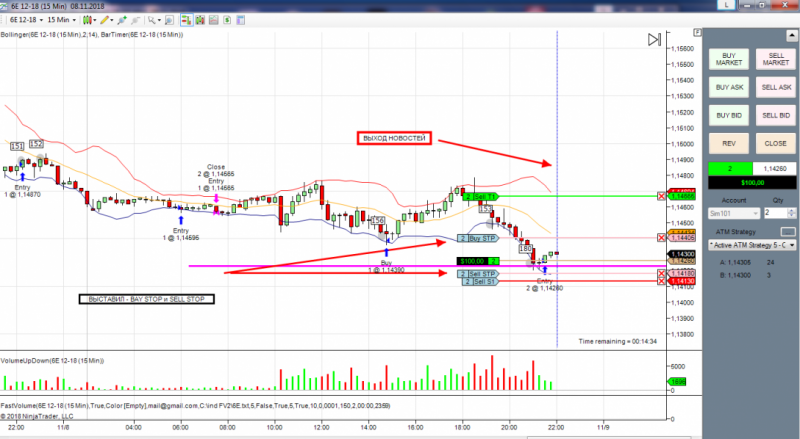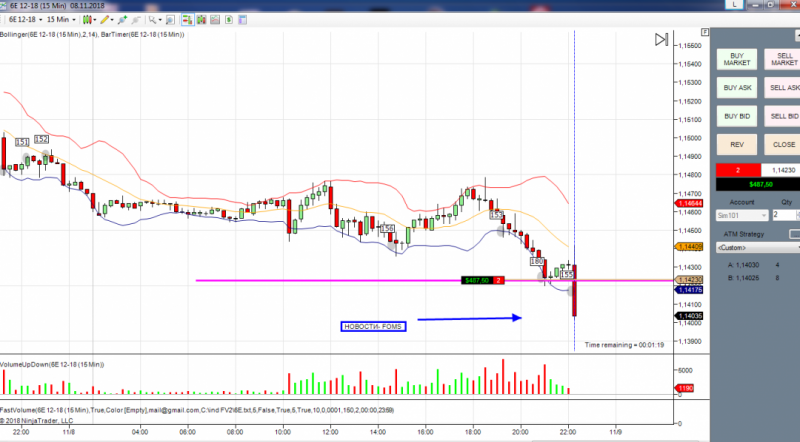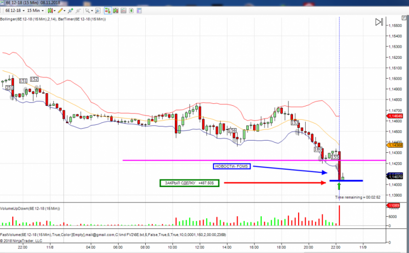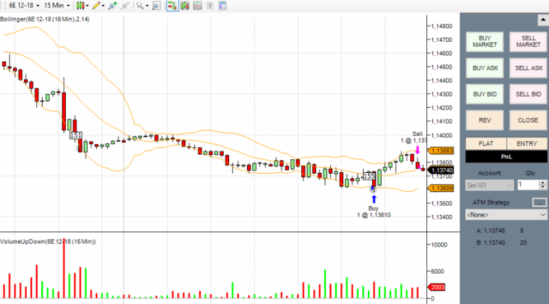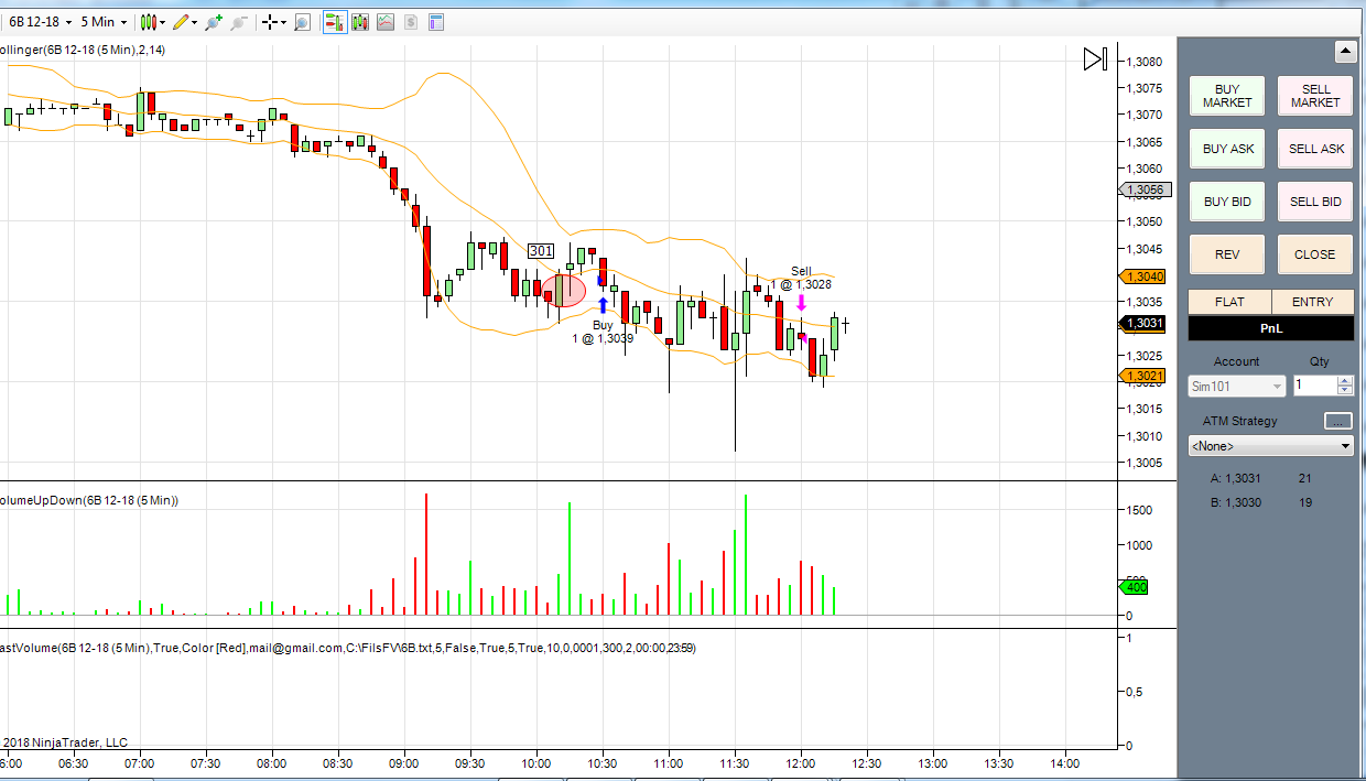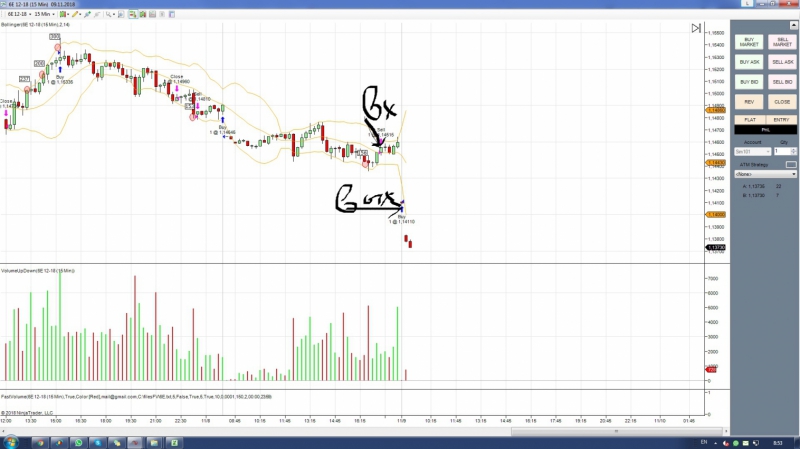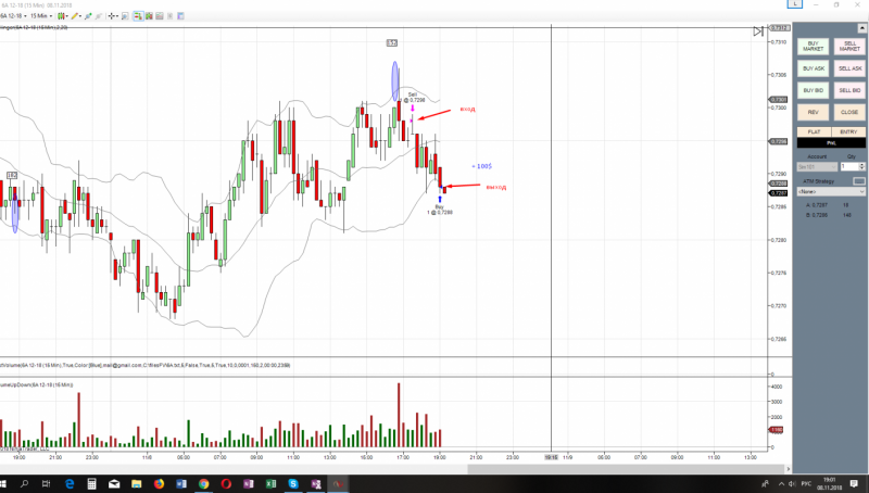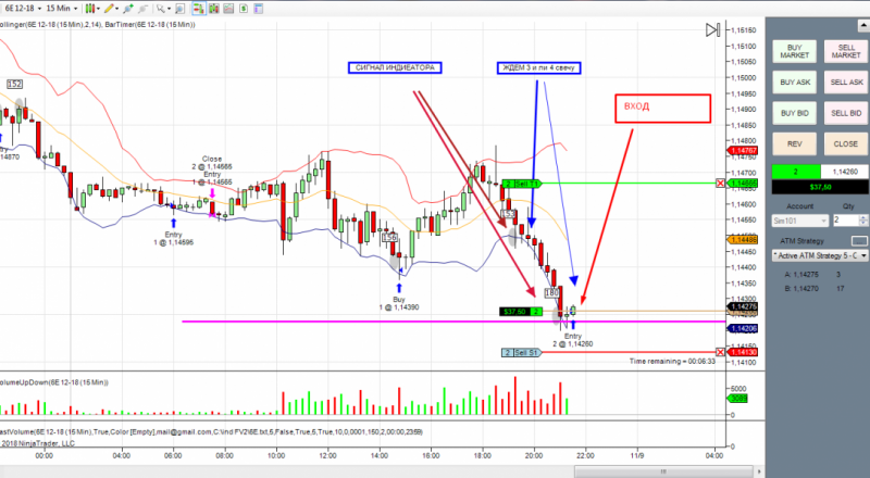 первая сделка по фьючерсу на фунт. Получен сигнал на покупку. Вход с подтверждением на 4 свечи.Но сделка закрыта, т.к. цена вошла в сужение по боллинжеру и наклон болинжера сменен в обратную сторону