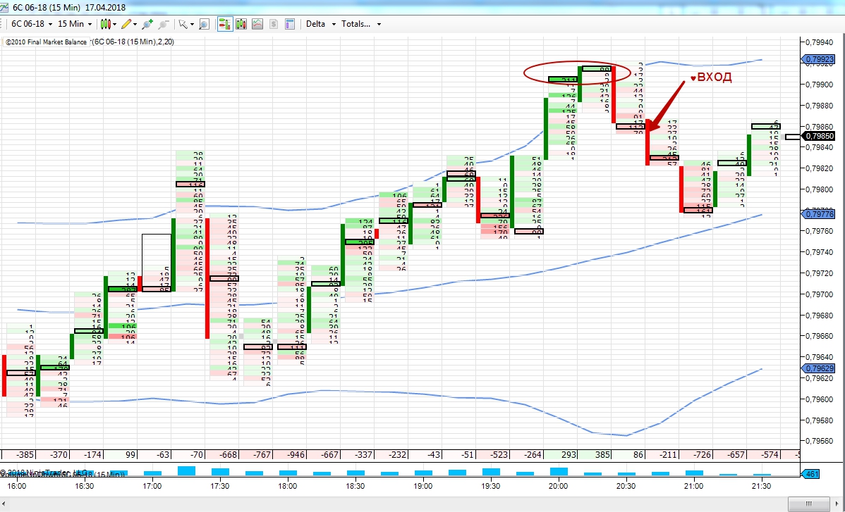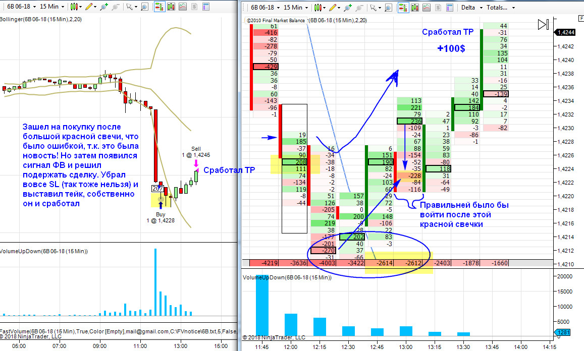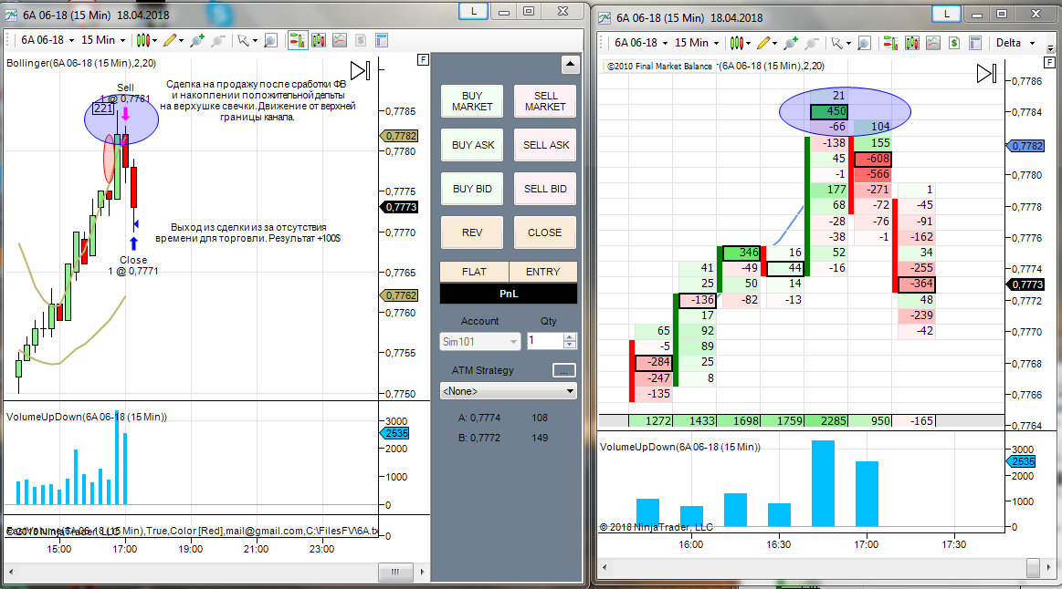 Результат +100$. Вход на продажу после сработки ФВ от верхней границы канала.